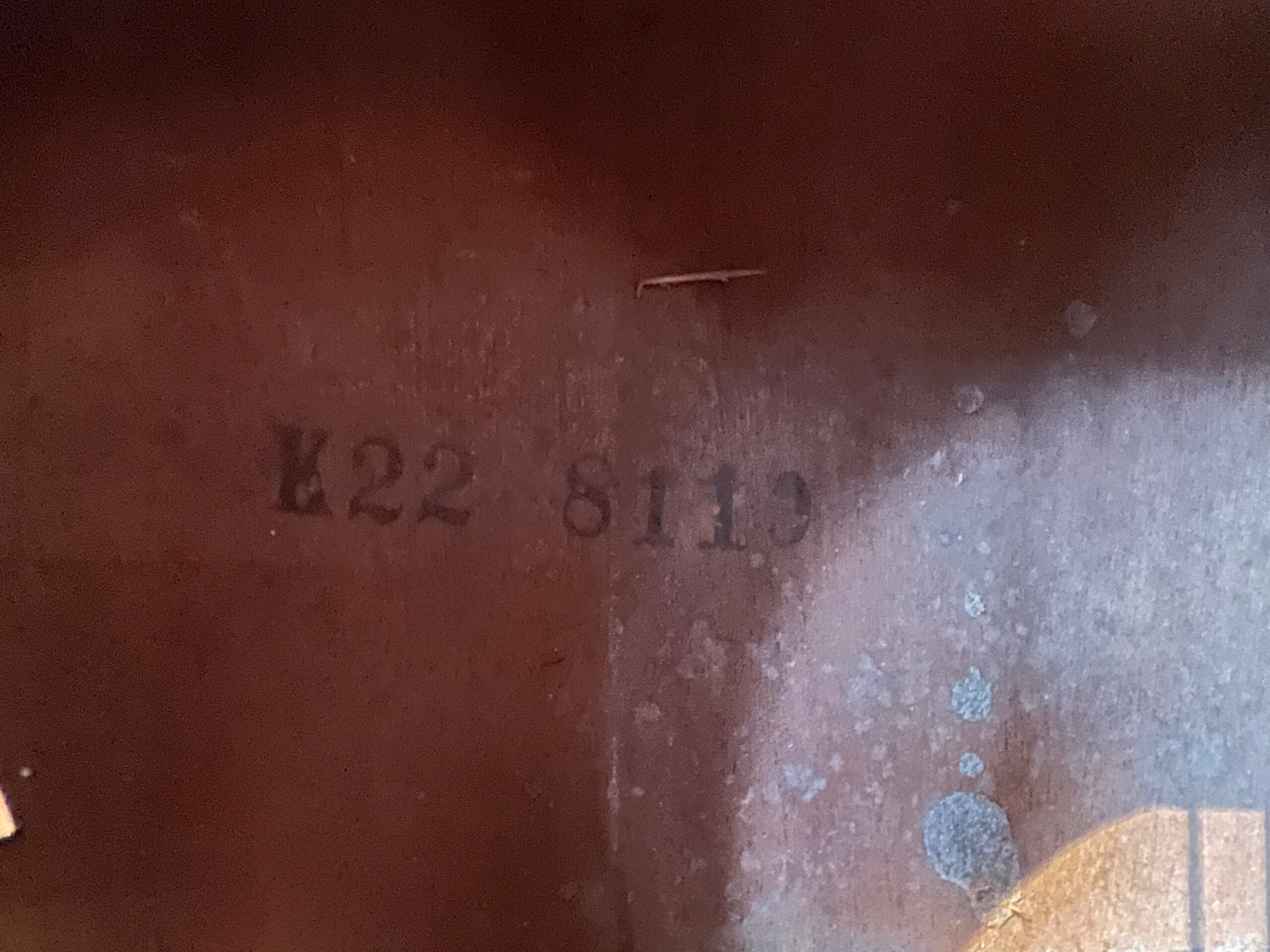 The flat-top has a slight bow in it, hence the need of a reset, but the reset has sorted the action out from the bridge as you can see. It genuinely plays really well now. It’s not the most perfect guitar, certainly played very well over the years, but it’s still a nice example of a 1950s Kay K22 Jumbo. Please see the pictures for more information as they form part of my description.